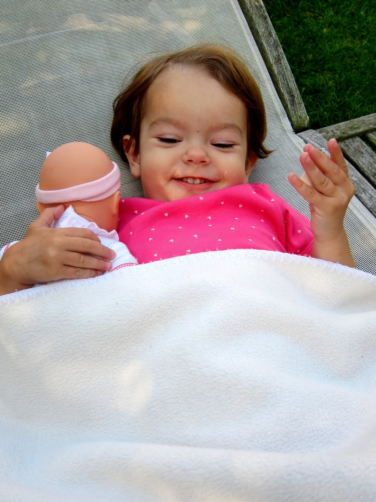 Elle aime aussi beaucoup installer des Playmobil dans le train et regarder Gilles faire rouler le tout, s'installer aux fourneaux et préparer des merveilles à base de pompons, et fouiller les caisses de Lego pour trouver des pièces qu'elle ne connaît pas encore. Elle commence aussi à y jouer avec nous en déplaçant ses personnages (et en répétant les dialogues de Gilles !) avec beaucoup de conviction.